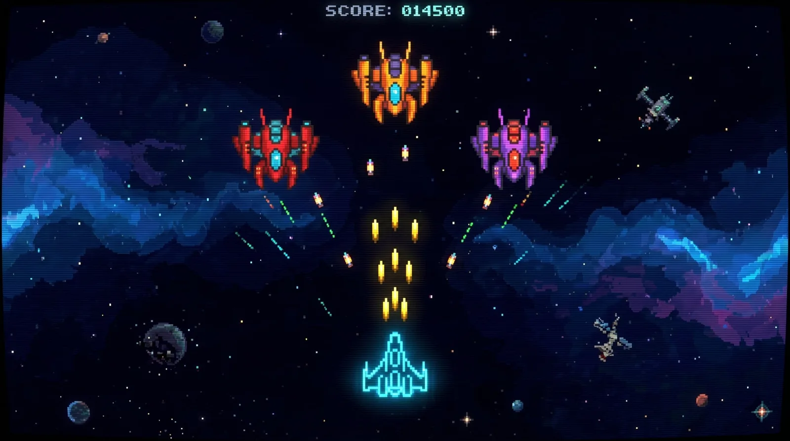 像素风,深色太空背景,霓虹色飞船和敌机